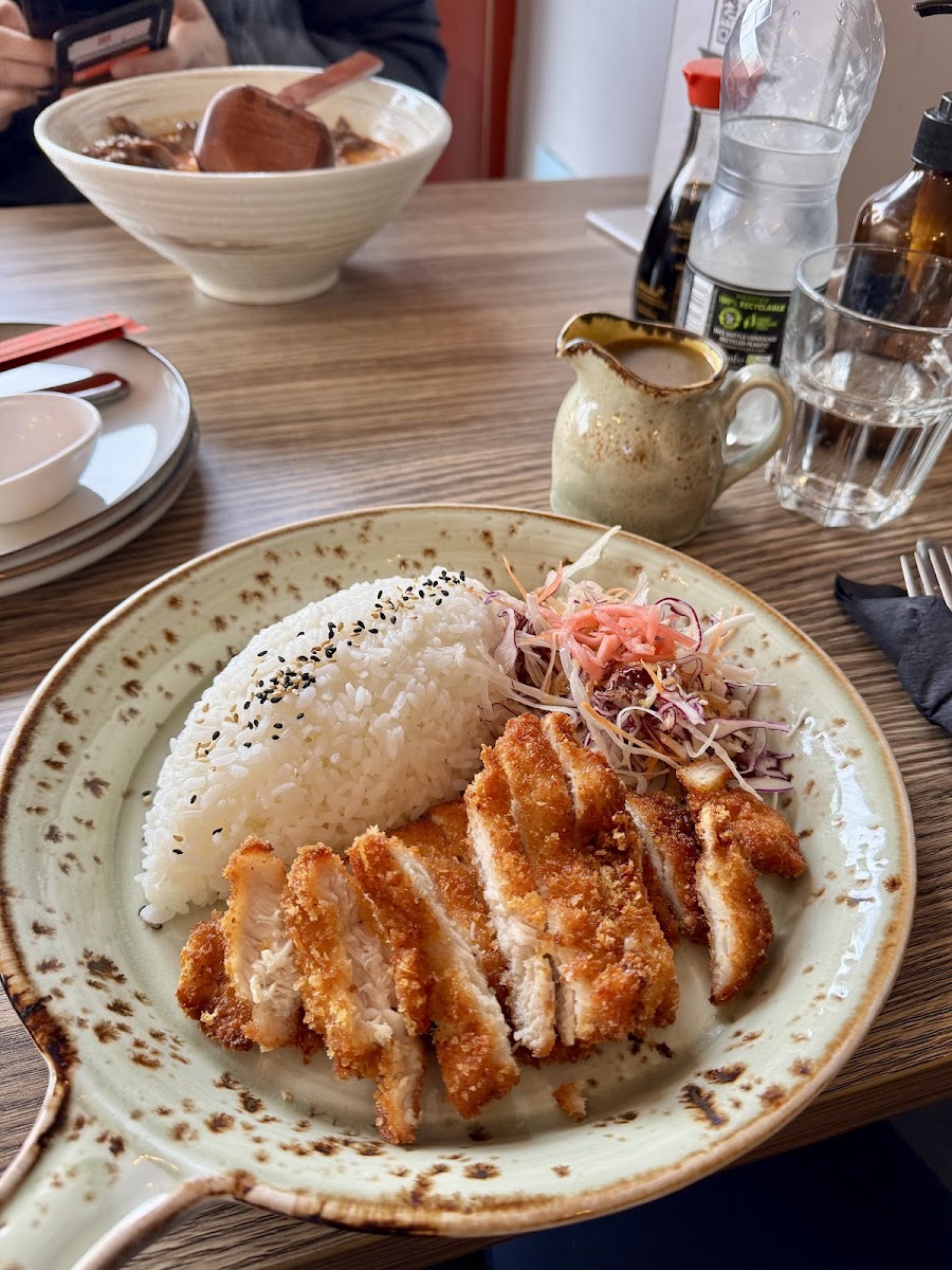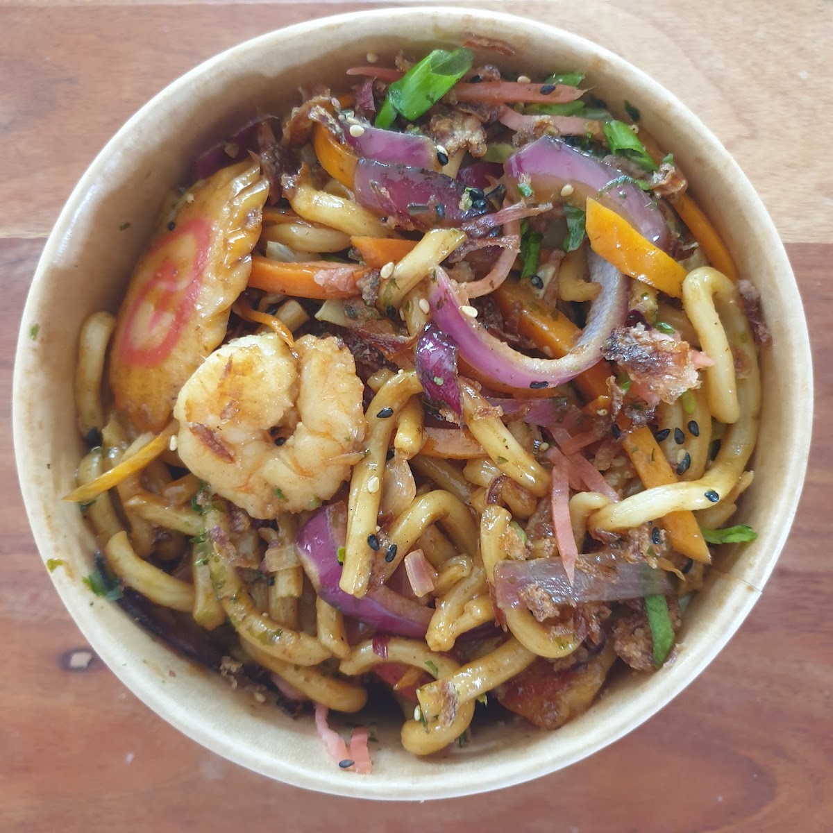 “Clean, modern place with excellent, colourful, on theme artwork across the counter. Friendly, efficient staff happy to help with ordering. Zumu Seafood Special with Udon: Big portion size, lots of seafood, lots of vegetables all liberally coated in sauce. Very flavourful with good depth and texture variety. Beef Teriyaki Ramen with Shoyu Broth: Broth was quite oily, but tasty and umami. The beef was tough, but the noodles had a good al dente texture, the vegetables had a nice crunch , the fish cake was very good and the egg was perfect. However, the packaging was abysmal! Why put broth in a paper cup with a paper lid in paper bags? Obviously it leaked and soaked through its paper bag and the larger paper bag it shared with the ramen bowl, so the main bag dropped my ramen onto the floor (upside-down and lid-less) with the broth bag, thankfully, barely hanging on. Fortunately the ramen was salvageable and I only lost about a third of the broth. Probably not a common occurrence , but I don’t think liquids should be packaged in paper.”